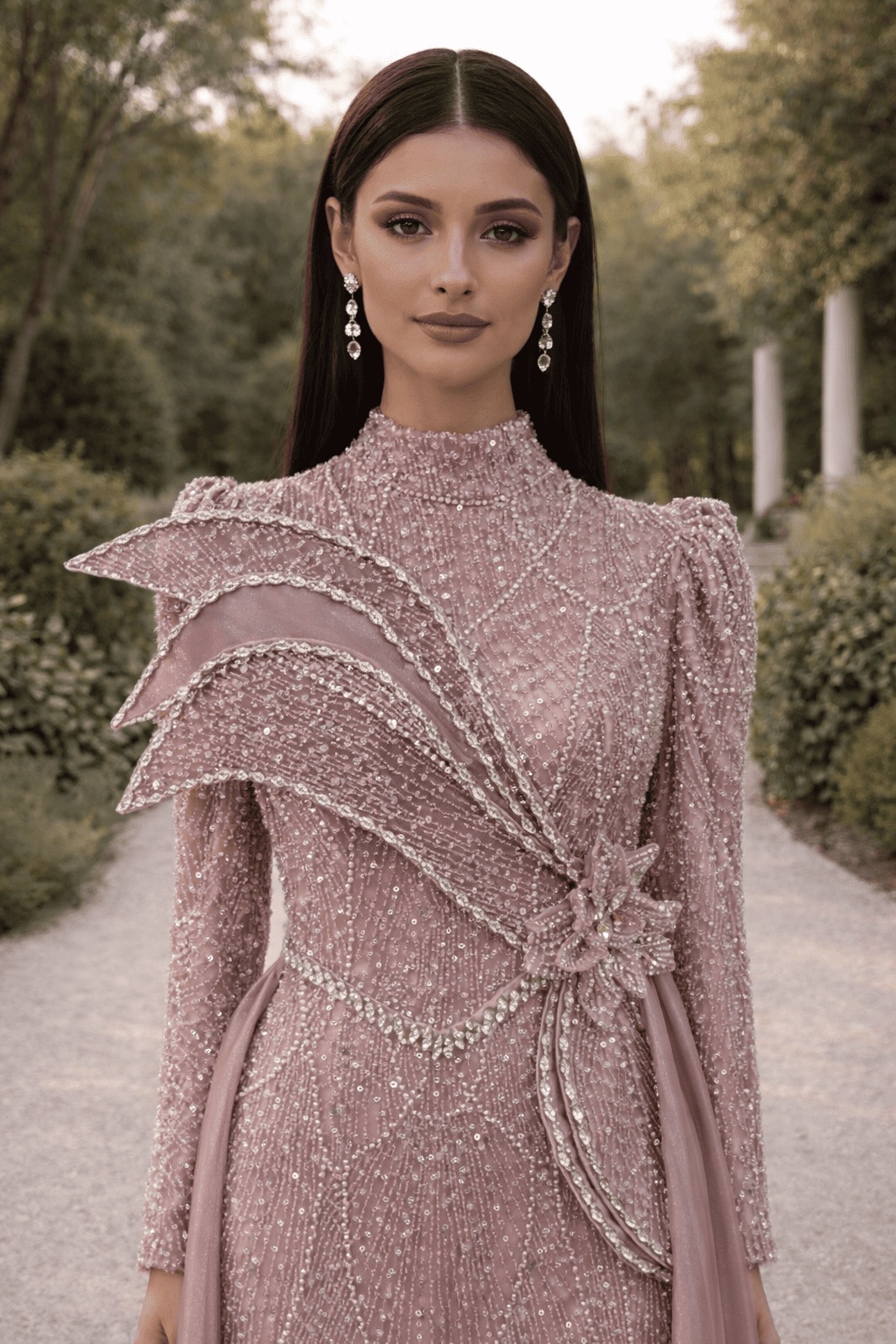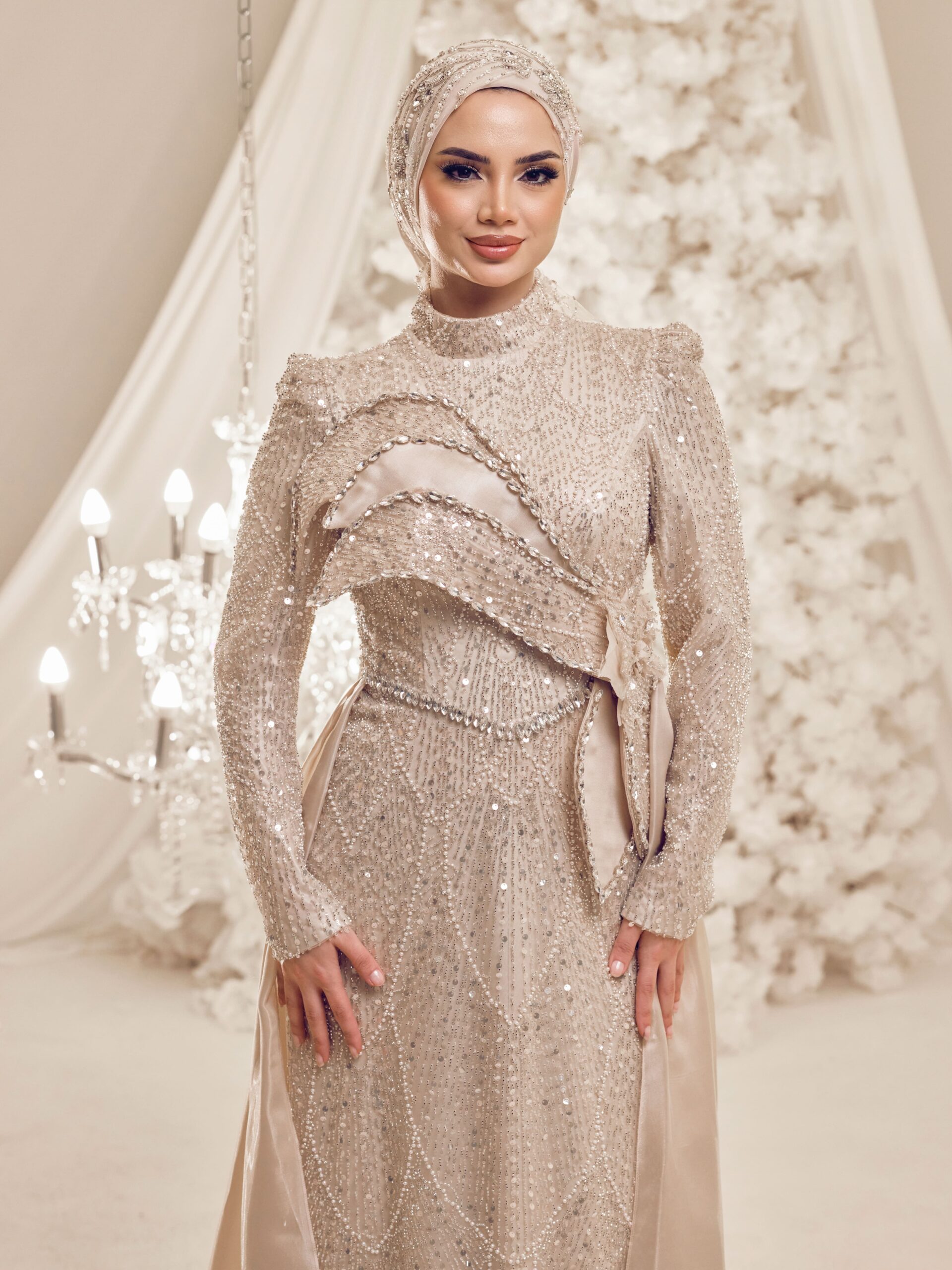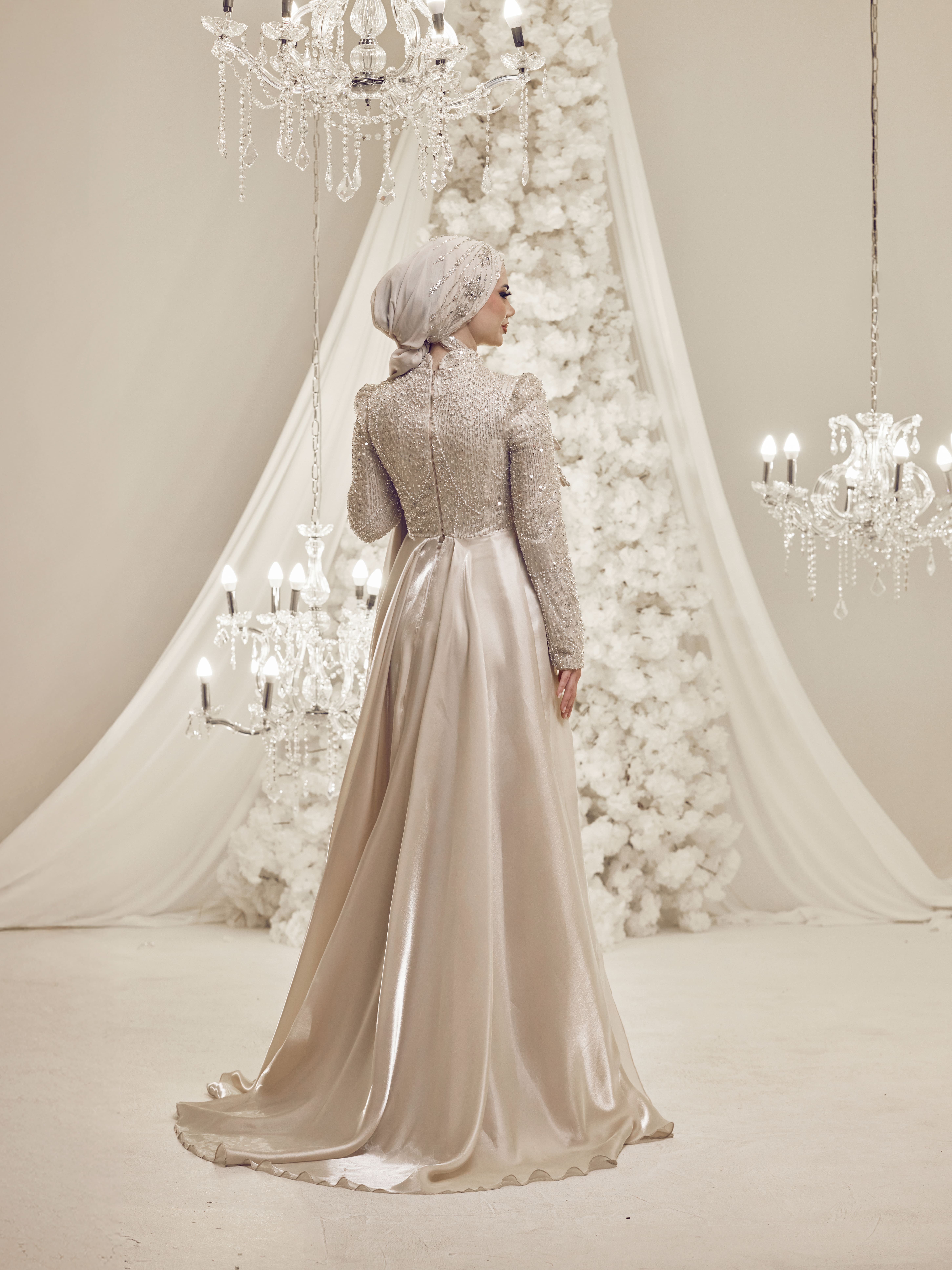 İthal dantelin narin görünümü ile omega kumaşın güçlü ve tok duruşunu dengeleyen, son derece modern bir silüet.