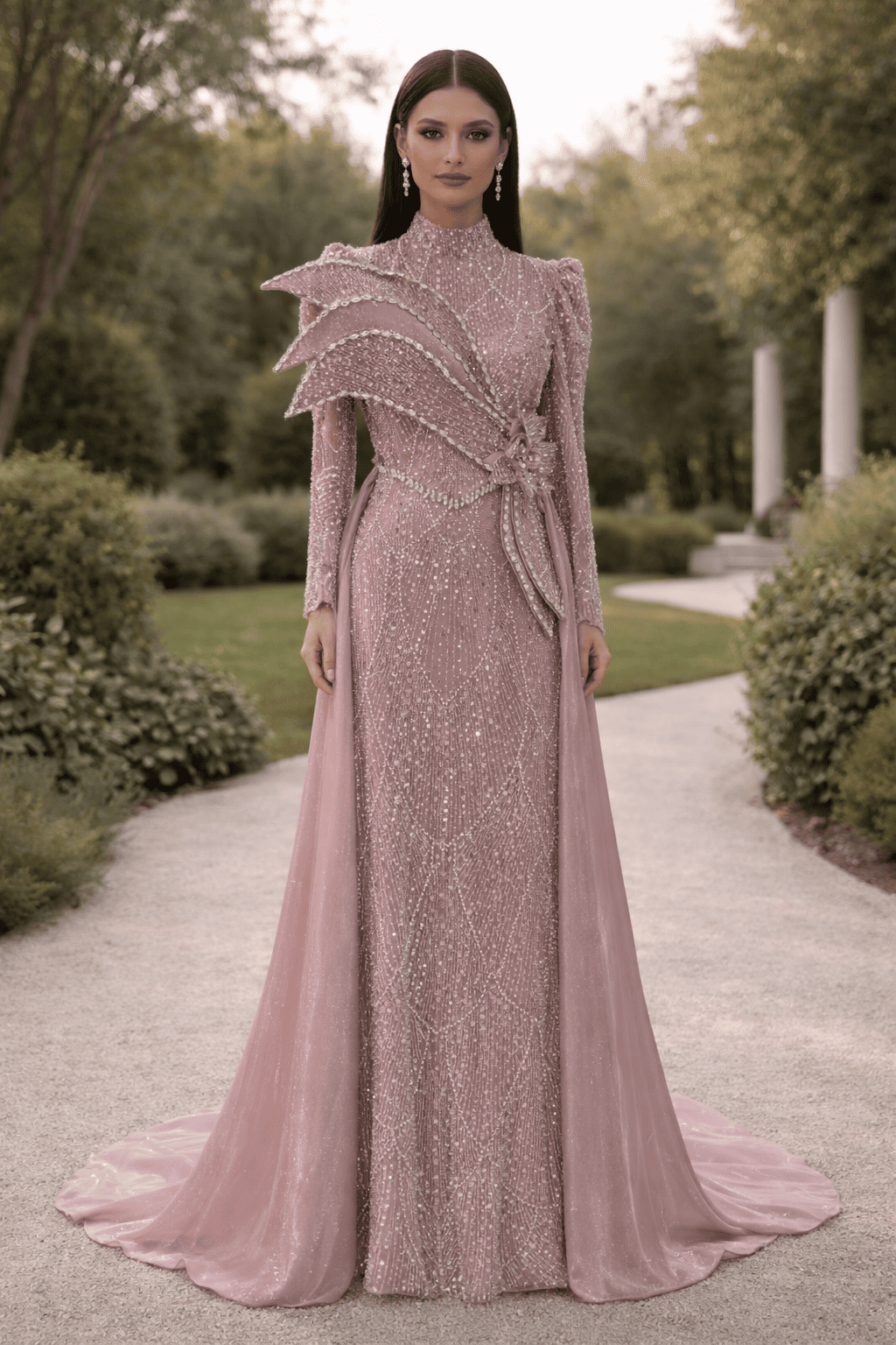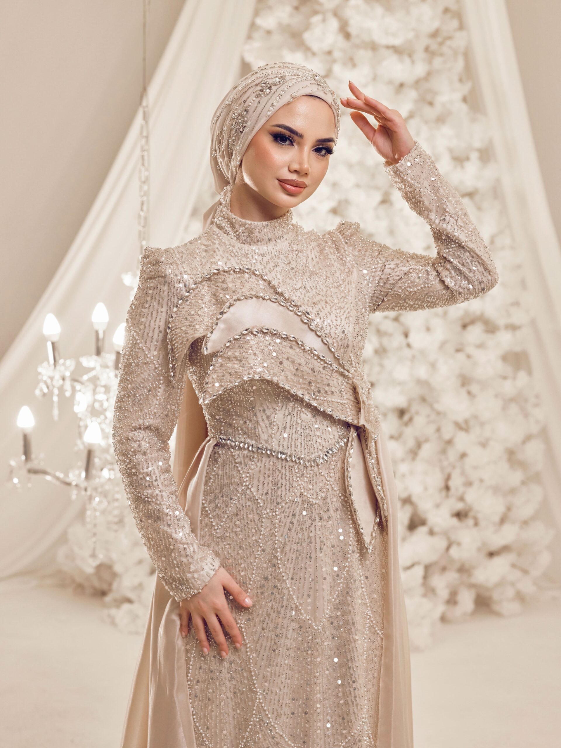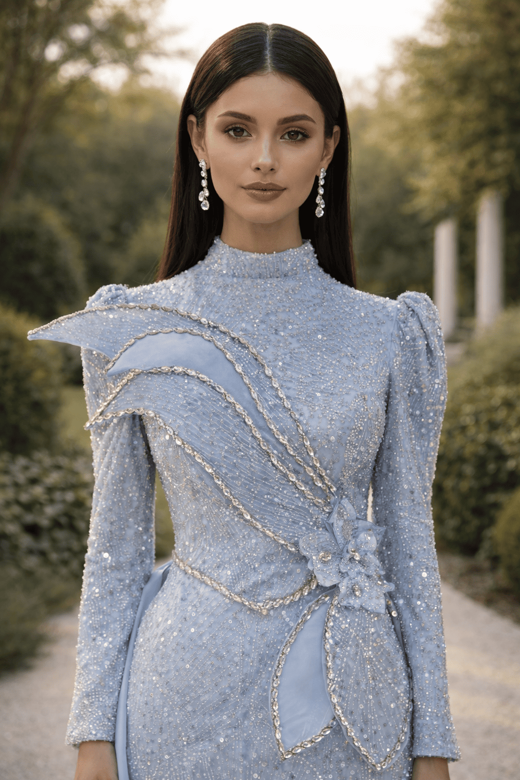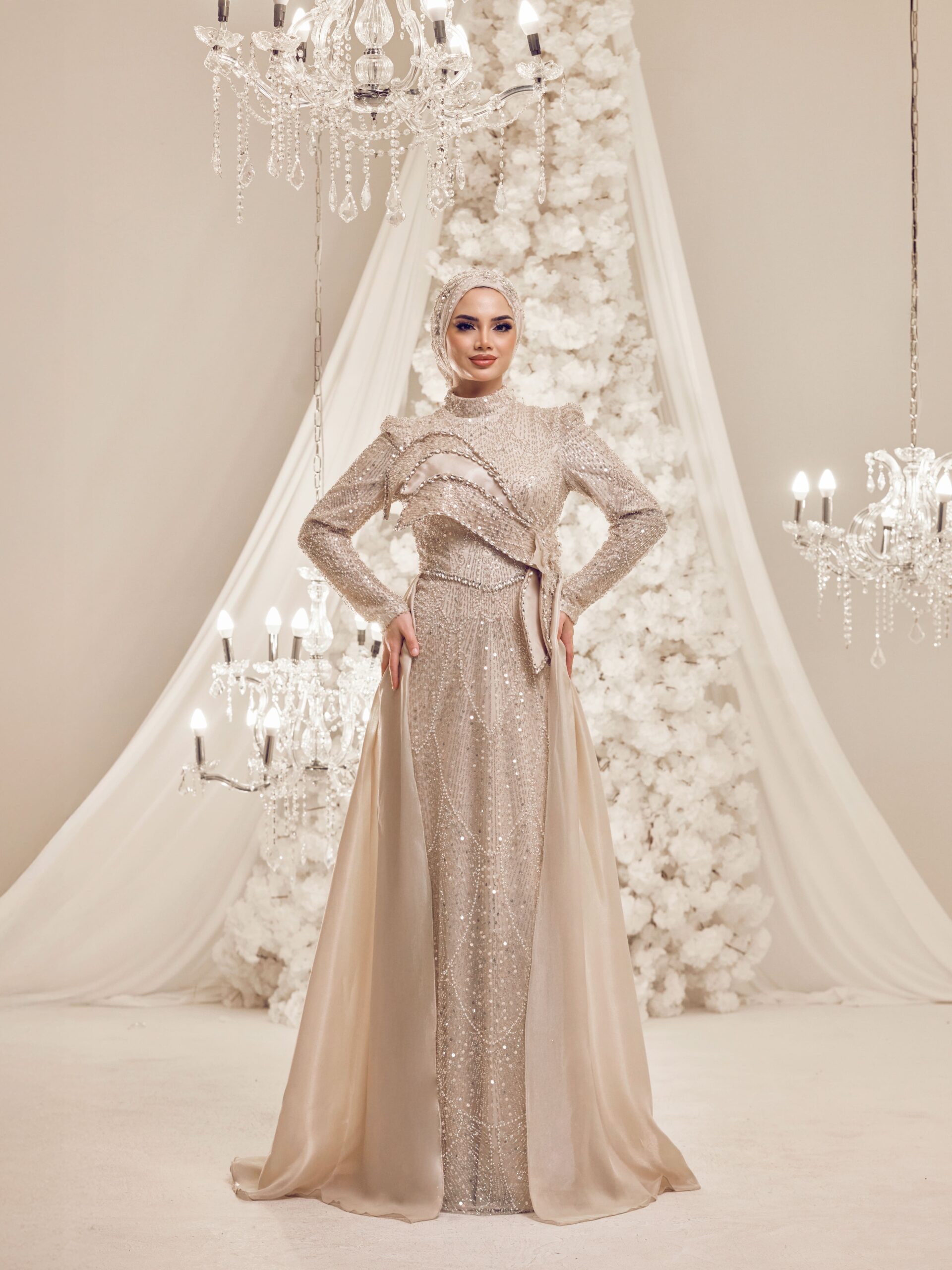 İthal dantelin narin görünümü ile omega kumaşın güçlü ve tok duruşunu dengeleyen, son derece modern bir silüet.