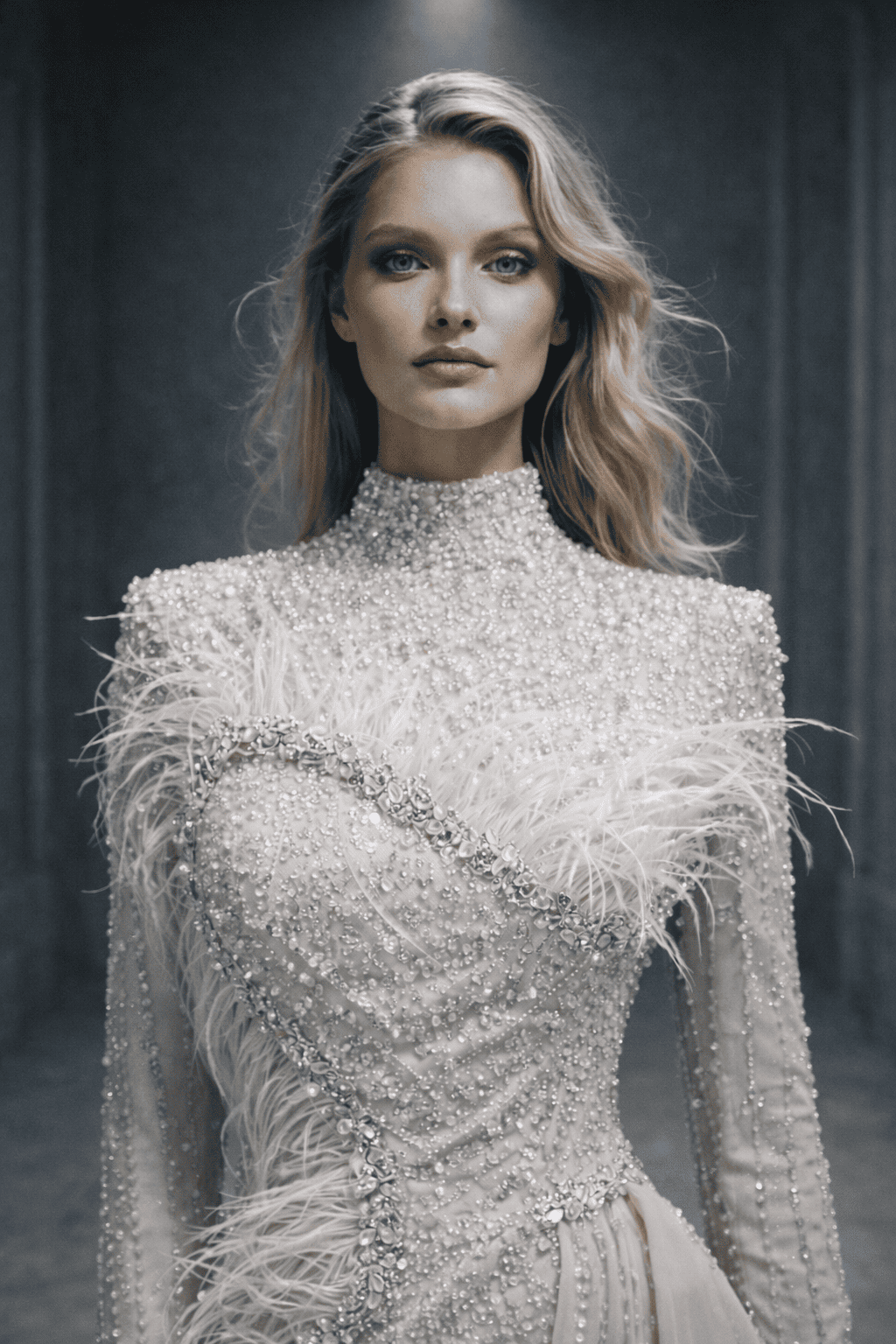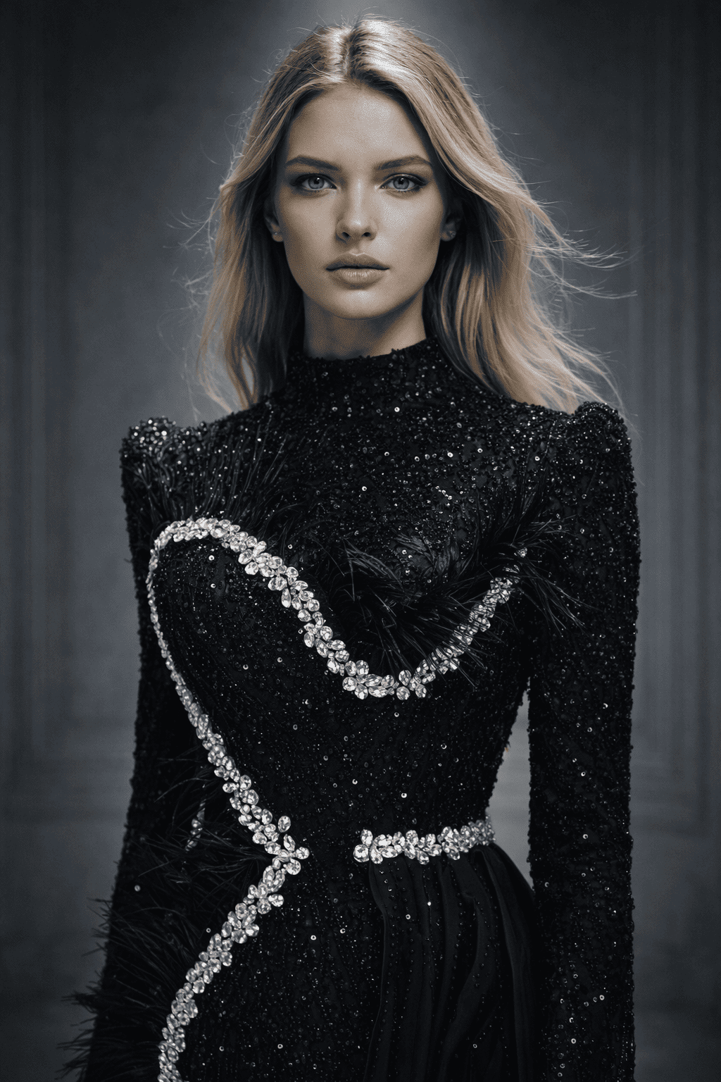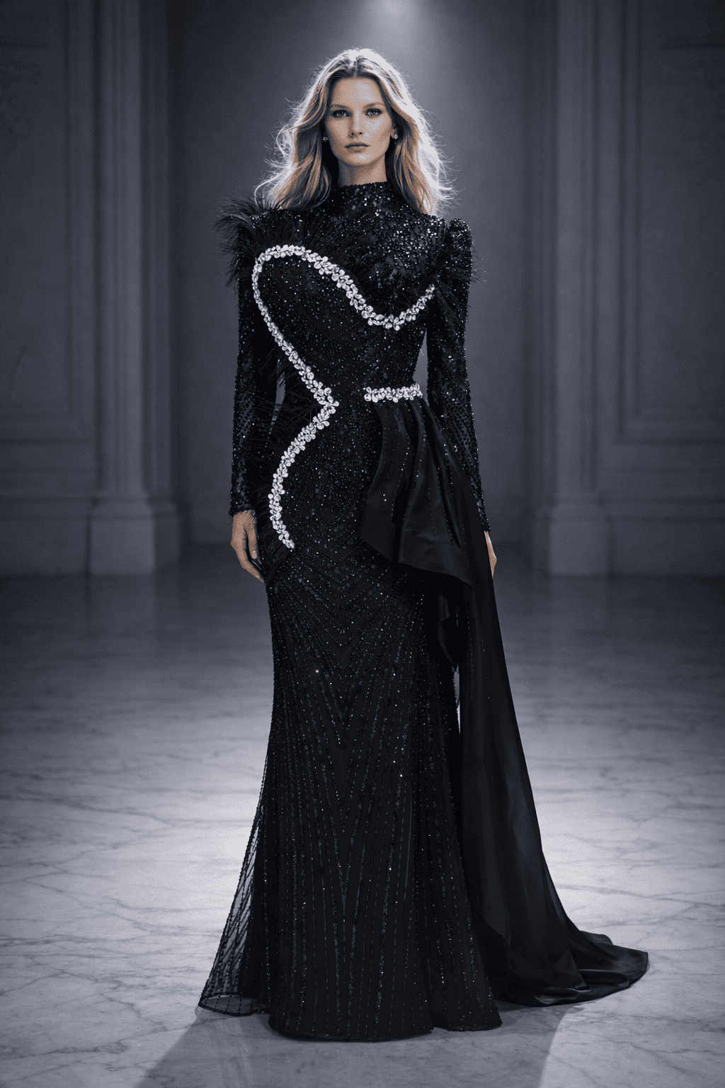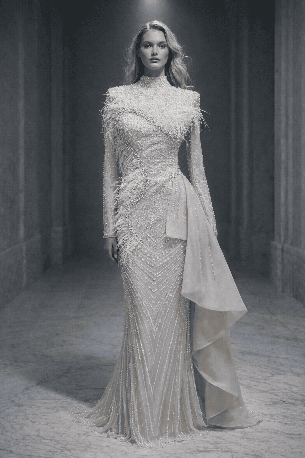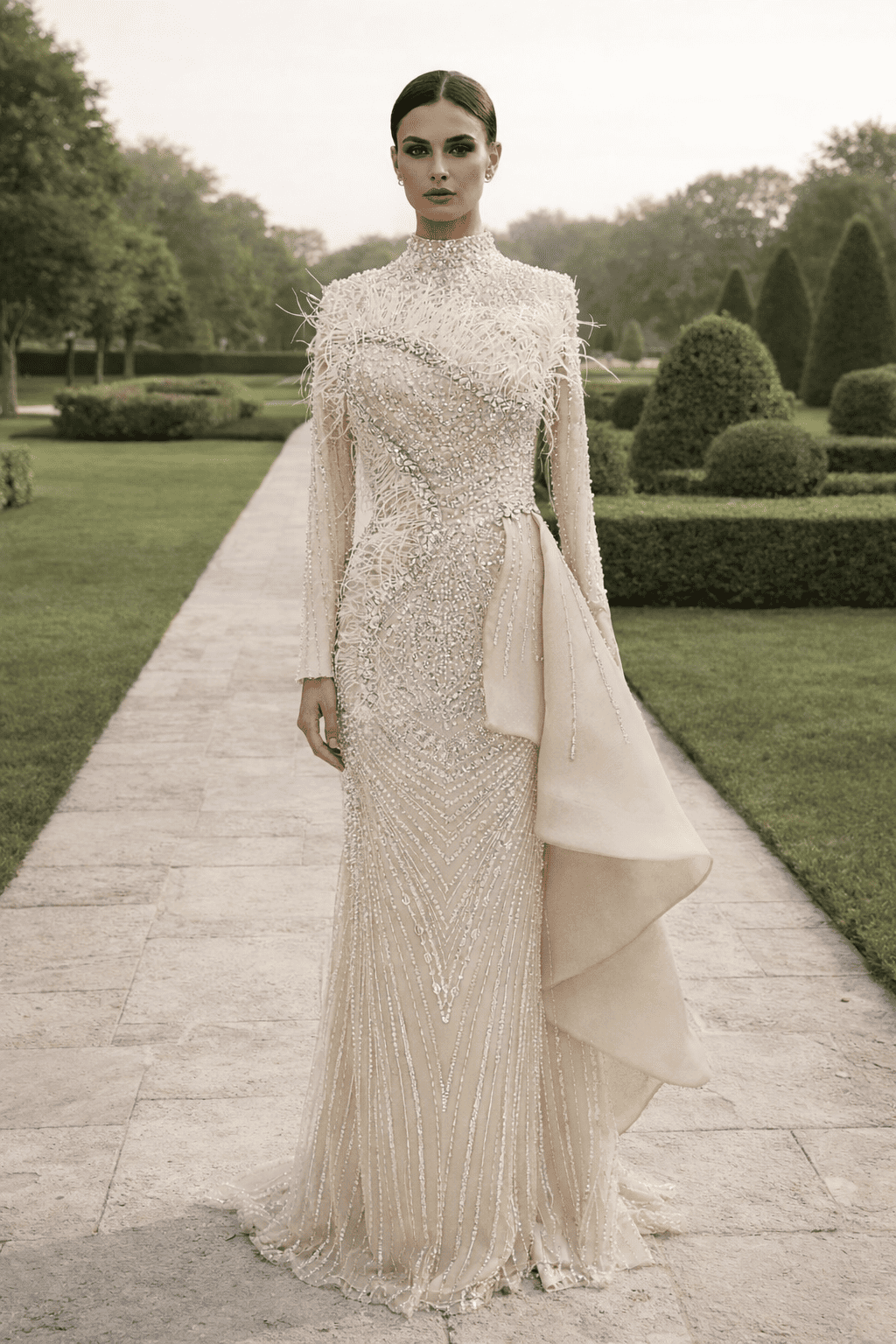 İthal dantelin ince işçiliği ve carolin kumaşın kaliteli dokusuyla harmanlanmış, göz alıcı ve elit bir tasarım.